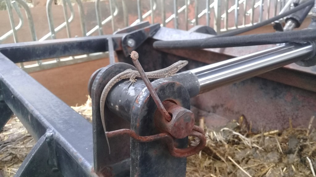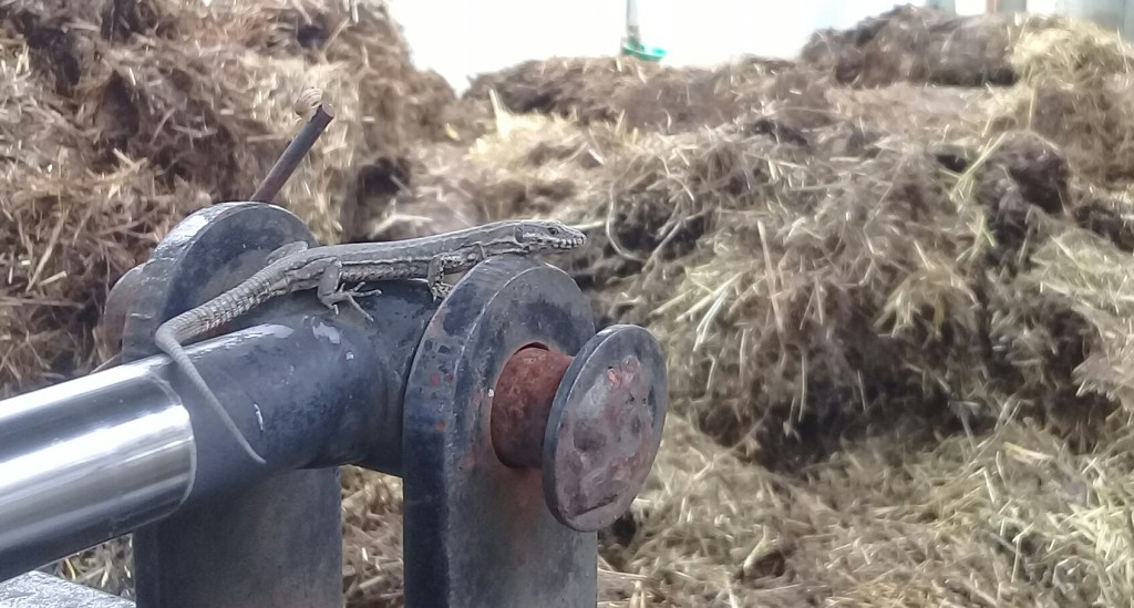 Aujourd’hui, c’était chantier « sortie du fumier de la chèvrerie » !! Le fumier sera épandu sur des cultures maraichères bio de la région 😉 Et sur la fourche du tracteur nous accompagnait ce beau lézard, aux 1ères loges ! Alors lézard vivipare ou lézard des murailles ? Sachez qu’il a été capturé et relâché au pied de la ferme… Belle journée à tous.